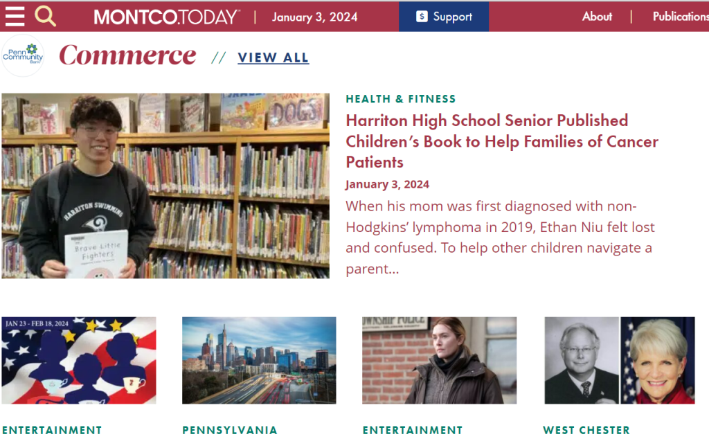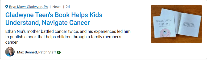 Realizing how much “Brave Little Fighters” could impact individuals, Ethan Niu decided to launch a campaign to donate 100 copies of his book across the country. So far, he’s reached many different communities, from Memorial Sloan Kettering Cancer Center in NYC (shown to the left), to Dr. Shubhada Shrikhande at Texas Oncology, to the West Philadelphia Tutoring Project at UPenn.